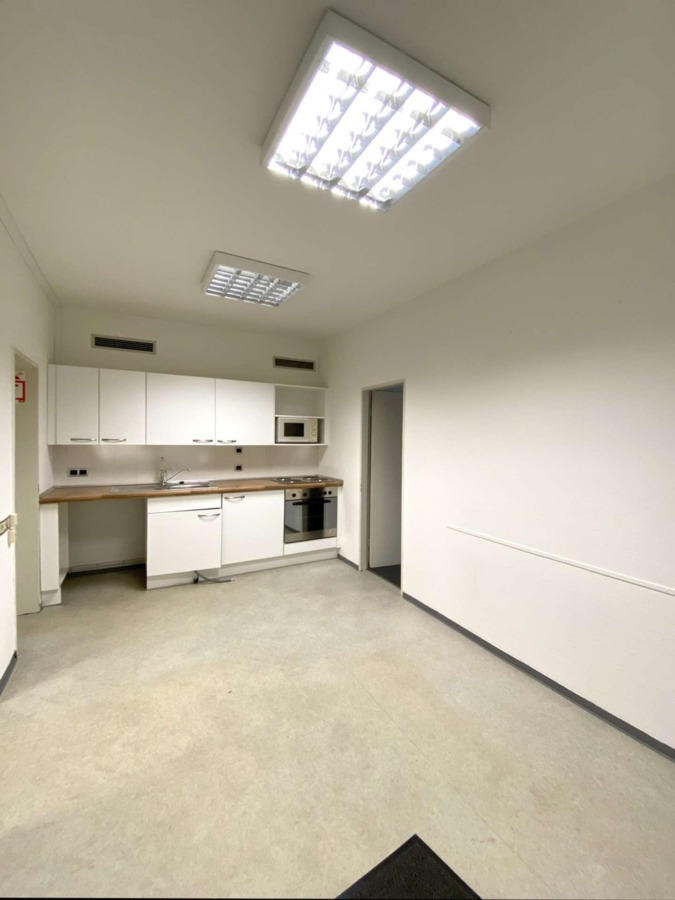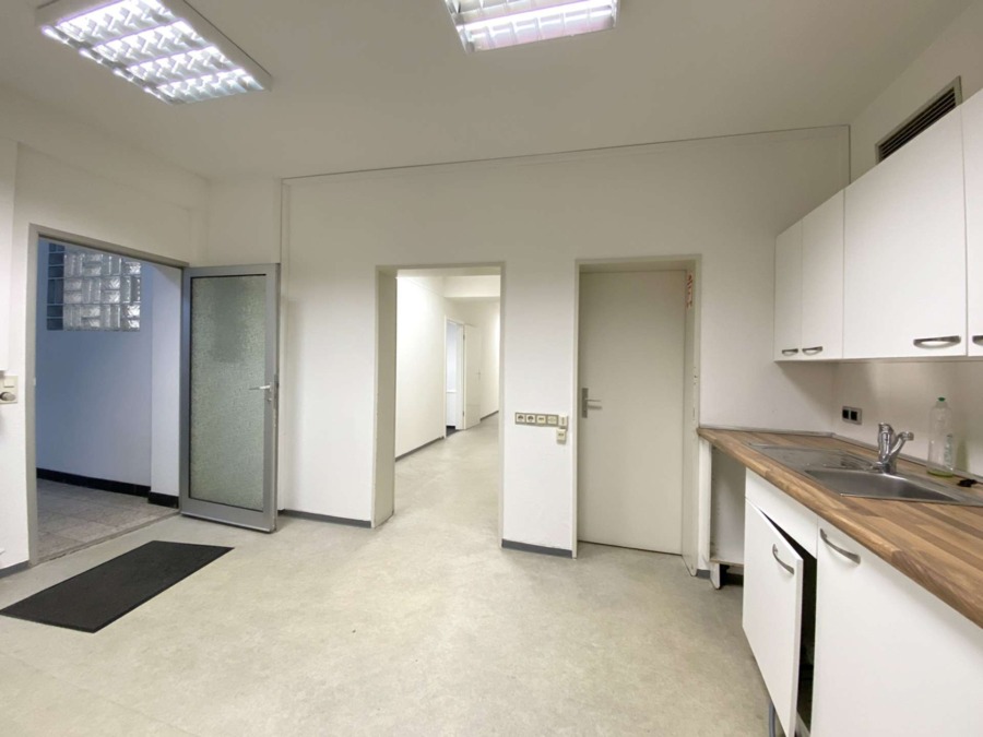 Die Fläche besteht aus zwei großen Räumen, die sich unseres Erachtens optimal als Behandlungs- oder Schulungsräume eignen. Ein Büro lässt sich hingegen optimal in den kleineren Zimmern einrichten. In der Teeküche befindet sich nicht nur die schicke Küche – hier ist auch ausreichend Platz für einen gemütlichen Aufenthalts- oder Pausenraum. Die Einbauküche mit weißen Fronten und allen E-Geräten steht dem neuen Mieter/der neuen Mieterin zur Verfügung.