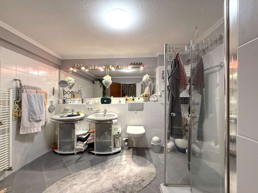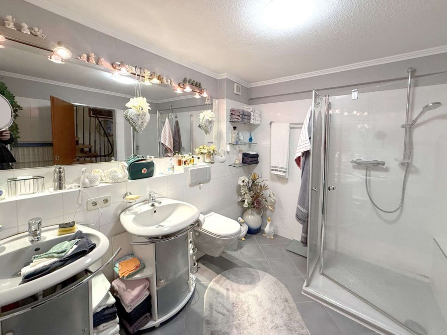 Das modernisierte Badezimmer mit bodengleicher Dusche im Obergeschoss bietet gehobenen Komfort.