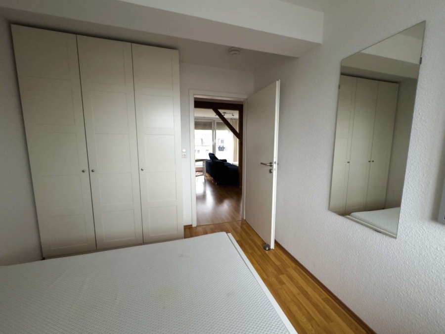 Wenn man die Wohnung betritt, befindet man sich im Eingangsbereich der Wohnung. Von dort aus kommt man in das Wohnzimmer. Blickt man rechts guckt man auf den Abstellraum. Zum Innenhof liegt das Duschbad und das Schlafzimmer. Die Kochnische ist vollständig ausgerüstet mit Herd/Ofen, Kühlschrank, Spüle und Schränken mit viel Stauraum.