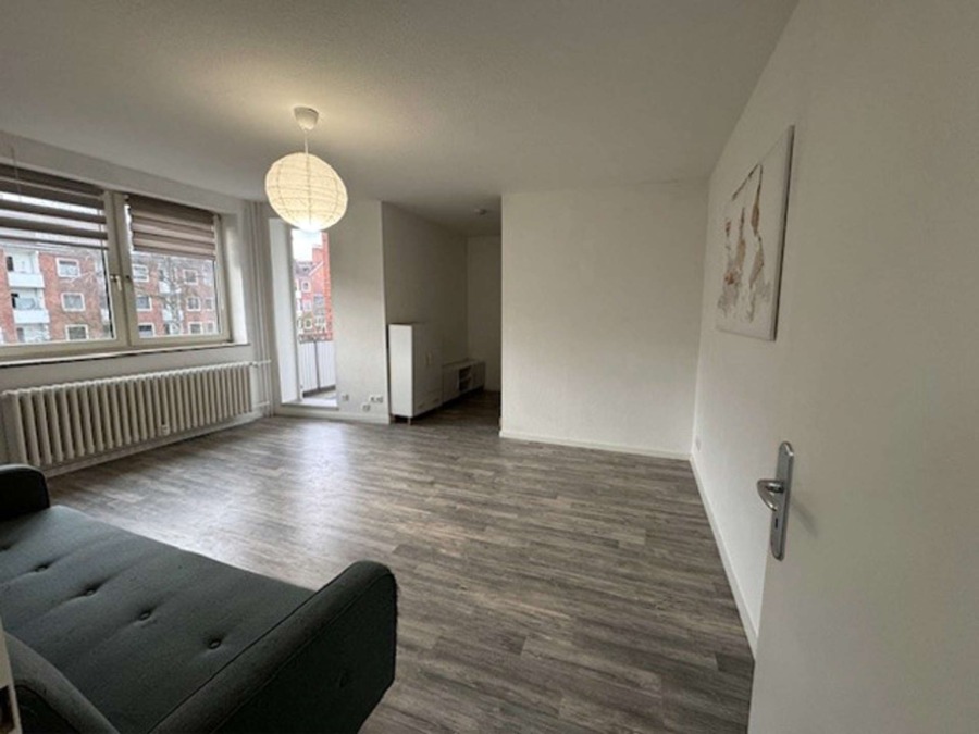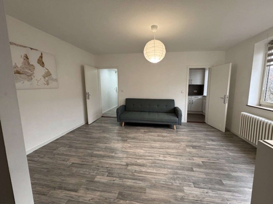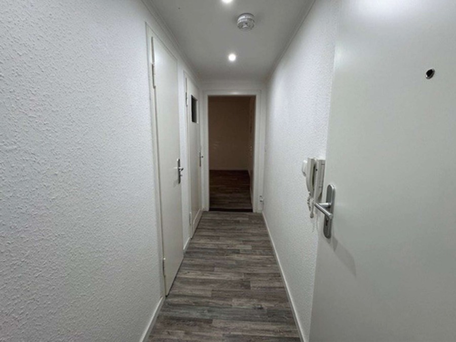 Wenn man die Wohnung betritt, befindet man sich im Flur der kleinen Wohnung. Links befinden sich ein Abstellschrank und das Duschbad. Geradeaus liegt das Wohn- und Schlafzimmer mit Zugang in die Küche und den Balkon.
