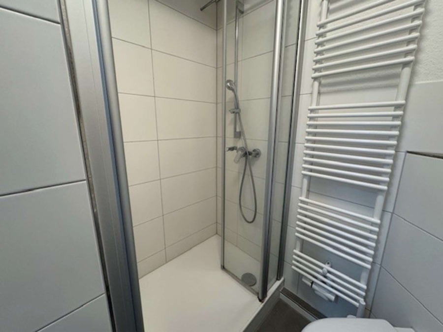 Das hell geflieste Duschbad ist mit einem Handtuchheizkörper ausgestattet.