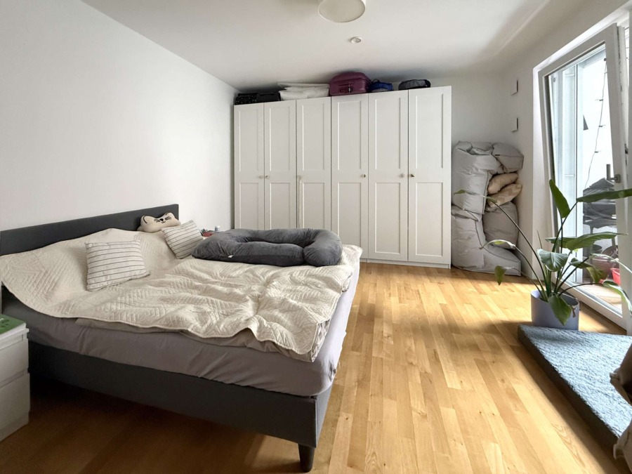 Die Wohnung verfügt neben dem offenen Wohnzimmer mit Zugang zum Balkon und über ein geräumiges Schlafzimmer mit Ankleidezimmer sowie direktem Zugang zum Badezimmer, welches modern mit Fußbodenheizung und einer Wanne ausgestattet ist. Die Wohnung verfügt über ein weiteres modernes Gäste-WC. Außerdem ist ein praktischer Abstellraum vorhanden, in dem eine Waschmaschine angeschlossen werden kann. Ein separater Kellerraum bietet weiteren Stauraum.