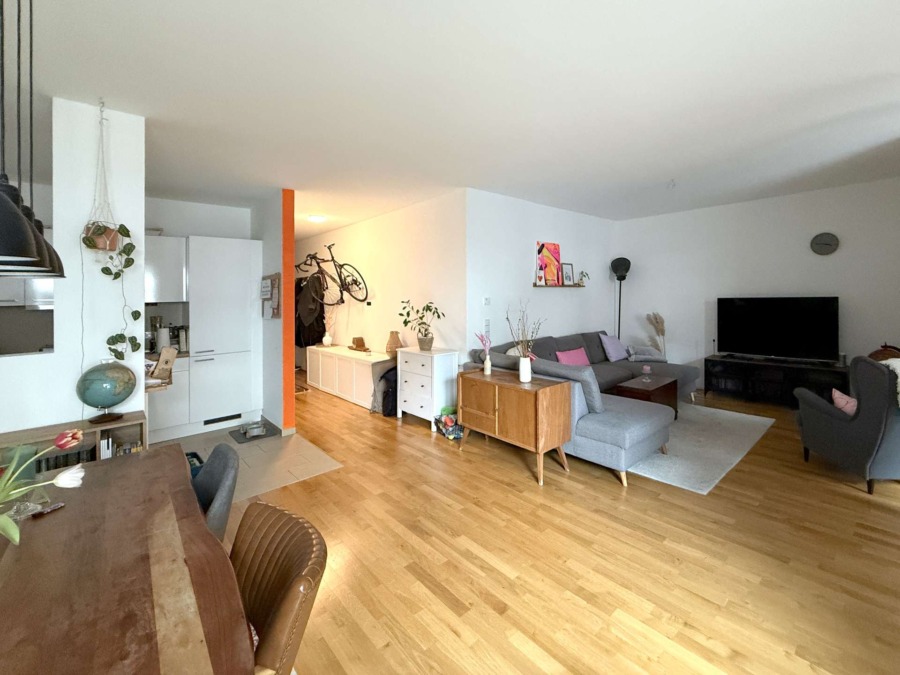 Beim Betreten der Wohnung fällt sofort der hochwertige Parkettboden ins Auge, der jedem Raum eine warme und zeitlose Note verleiht, während die offene Raumgestaltung ein großzügiges Wohngefühl vermittelt.