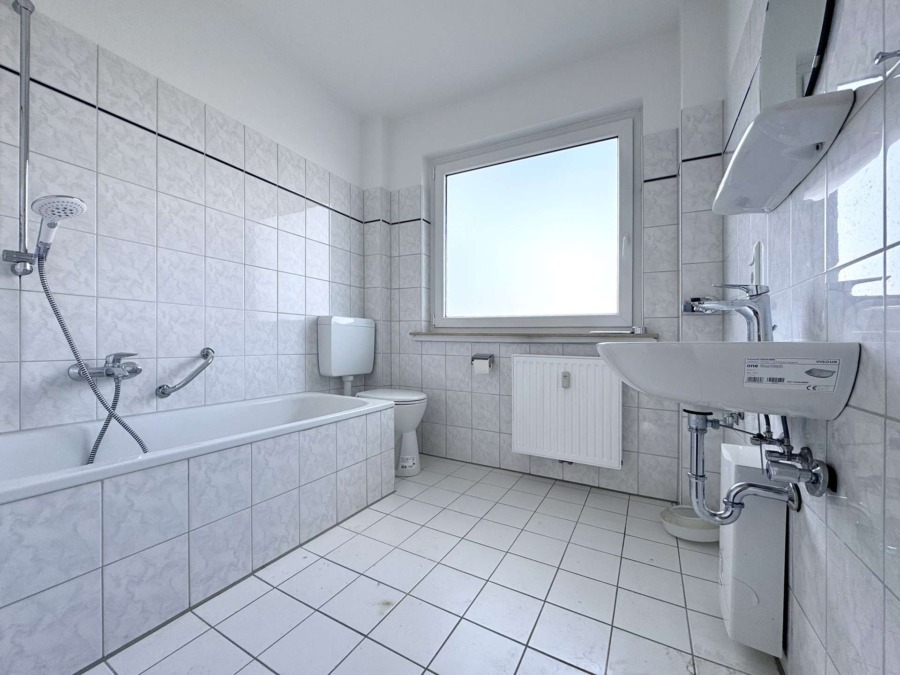 Die Küche hat einen weißen Fliesenspiegel und wird mit Einbauküche vermietet. Das Badezimmer ist modern gestaltet und bietet dem neuen Mieter eine Badewanne und ein Fenster.
